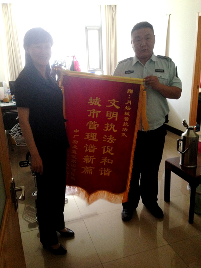 真武家園小區(qū)南門外長期有小販在此擺攤賣水果、蔬菜,給小區(qū)業(yè)主出入造成諸多不便,由于是在小區(qū)大門外,小販們對物業(yè)管理不配合。為此真武家園項目部將此情況上報月壇城管執(zhí)法隊,月壇執(zhí)法隊在短時間內(nèi)就將長期在真武家園南門擺攤的小販們徹底清除。為了感謝月壇城管執(zhí)法隊對項目部工作的支持,2015年5月19日,真武家園項目部特向月壇城管執(zhí)法隊贈送錦旗“文明執(zhí)法促和諧,城市管理譜新篇”,以示感謝。