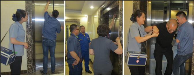 電梯維保單位人員協(xié)同項(xiàng)目電梯安全員將電梯設(shè)置故障,被困轎廂人員(維保部員工扮演)立即按響警鈴,隨著警鈴的響起,演練活動(dòng)拉開序幕。監(jiān)控運(yùn)行值班員迅速做出反應(yīng),一邊詢問被困人員情況,安撫其不要著急等待救援,一邊通知客服電梯出現(xiàn)故障有人被困,并通報(bào)具體情況??头藛T立即向經(jīng)理助理及設(shè)備維保部主管進(jìn)行匯報(bào),同時(shí)另一名客服人員攜帶應(yīng)急醫(yī)藥箱趕赴現(xiàn)場對被困人員進(jìn)行安撫。
