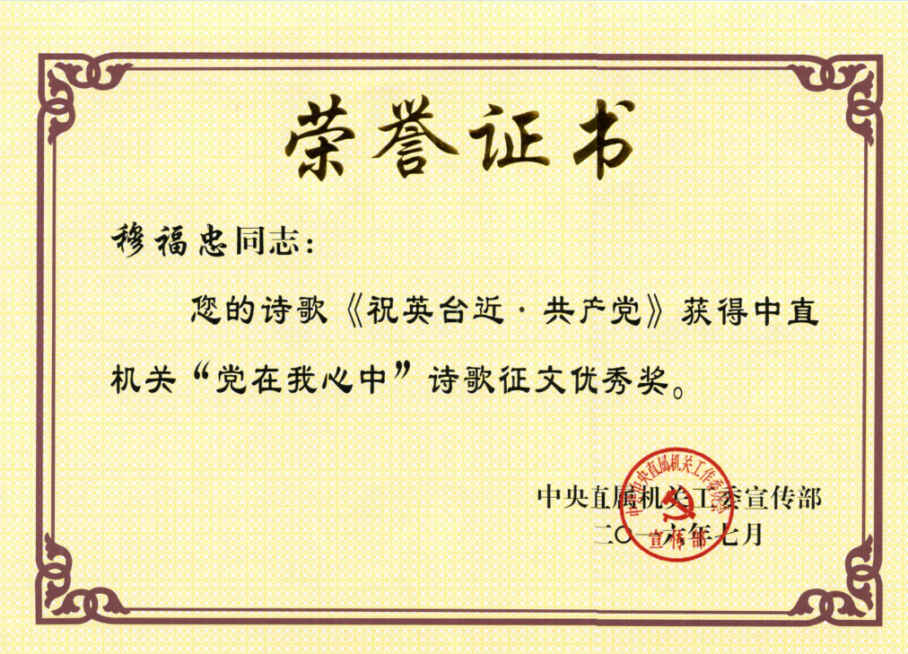 在慶祝中國(guó)共產(chǎn)黨成立95周年、紀(jì)念中國(guó)工農(nóng)紅軍長(zhǎng)征勝利80周年之際,中直工委舉辦了中直機(jī)關(guān)“黨在我心中”詩(shī)歌征文活動(dòng),公司黨總支按照要求動(dòng)員部署,公司黨員、入黨積極分子、寫(xiě)申請(qǐng)書(shū)人員和廣大員工積極踴躍投稿。穆福忠同志的詩(shī)歌《祝英臺(tái)近?共產(chǎn)黨》獲得中直機(jī)關(guān)“黨在我心中”詩(shī)歌征文優(yōu)秀獎(jiǎng)。