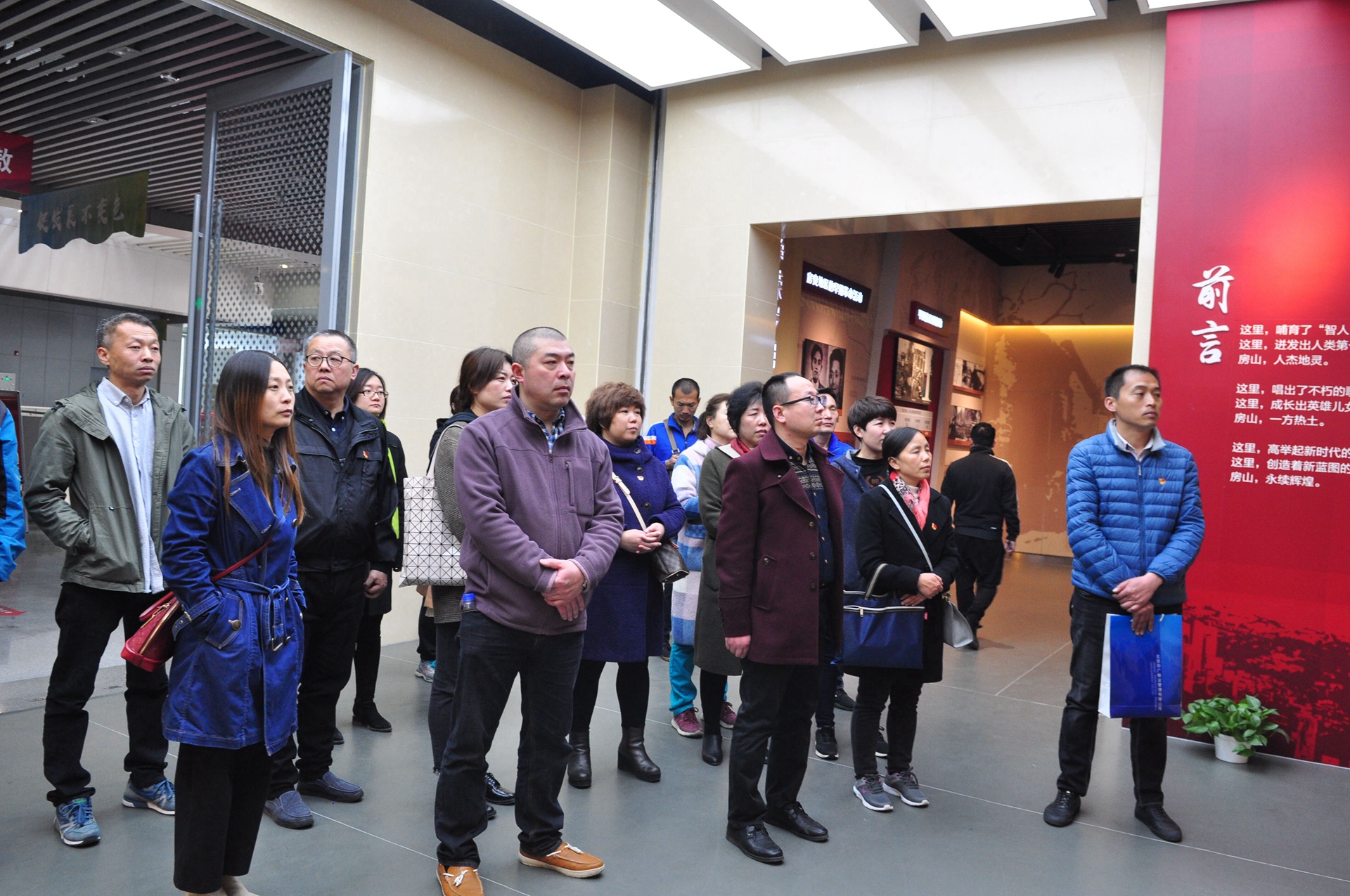 最后,大家參觀了房山區(qū)黨群服務(wù)活動(dòng)中心。走進(jìn)活動(dòng)中心,一個(gè)像一艘航行在水中的紅色風(fēng)帆的創(chuàng)意雕塑首先躍入眼簾,這個(gè)雕塑寓意著新時(shí)代中國(guó)特色社會(huì)主義向著第一目標(biāo)、第二目標(biāo)和“兩個(gè)一百年”的奮斗目標(biāo)揚(yáng)帆起航。雕塑的兩側(cè)是五線譜一樣的五層結(jié)構(gòu),星星像音符一樣跳躍在五線譜上,它寓意著在中國(guó)共產(chǎn)黨帶領(lǐng)下,奏響和諧樂(lè)章。大家參觀了“不忘初心,牢記使命”大型主題展,通過(guò)“紅色地標(biāo)述說(shuō)新中國(guó)從這里走來(lái)”展覽,回顧了新中國(guó)成立的波瀾壯闊的歷史;通過(guò)“習(xí)近平新時(shí)代中國(guó)特色社會(huì)主義思想引領(lǐng)我們前進(jìn)”展覽,生動(dòng)闡釋了習(xí)近平新時(shí)代中國(guó)特色社會(huì)主義思想的精神內(nèi)涵,深化了大家對(duì)習(xí)近平新時(shí)代中國(guó)特色社會(huì)主義思想的精神內(nèi)涵的理解和學(xué)習(xí)。黨史情景教育基地在內(nèi)容展示上,采用情景還原、景中景的方式,并綜合運(yùn)用高科技手段,給大家身臨其境之感,增強(qiáng)了黨史教育的生動(dòng)性和有效性。