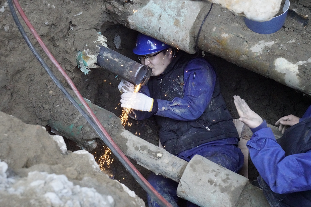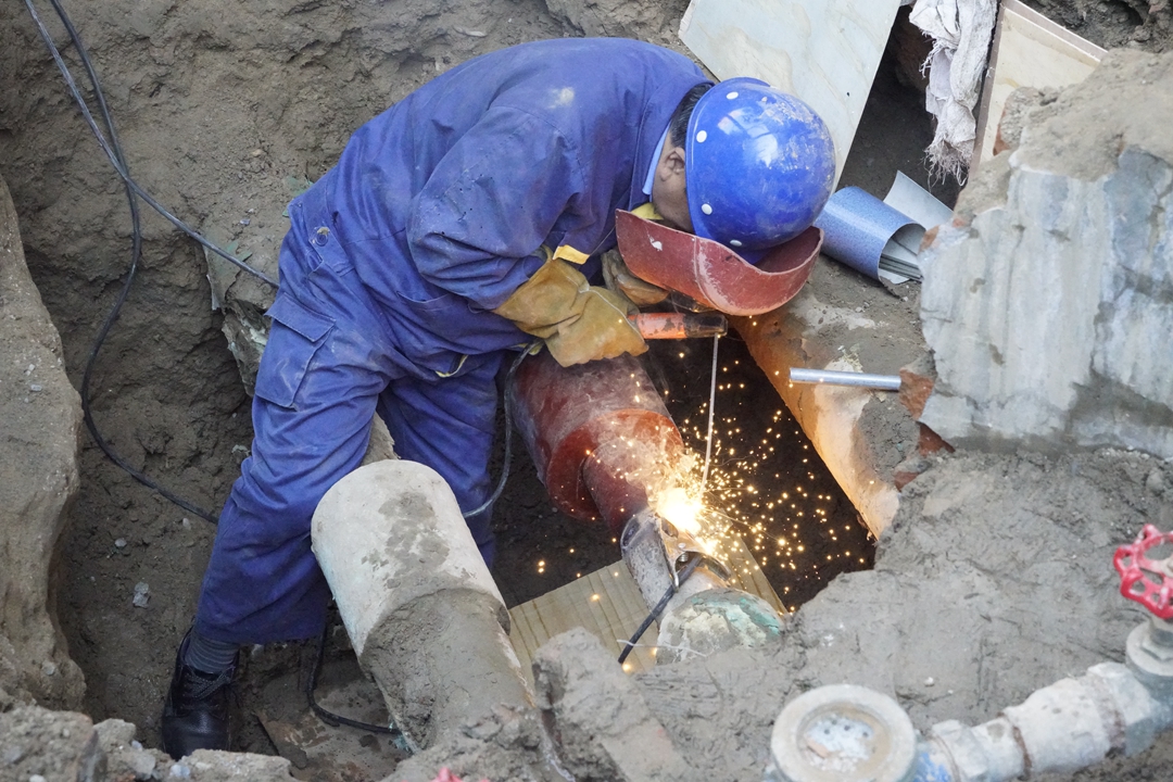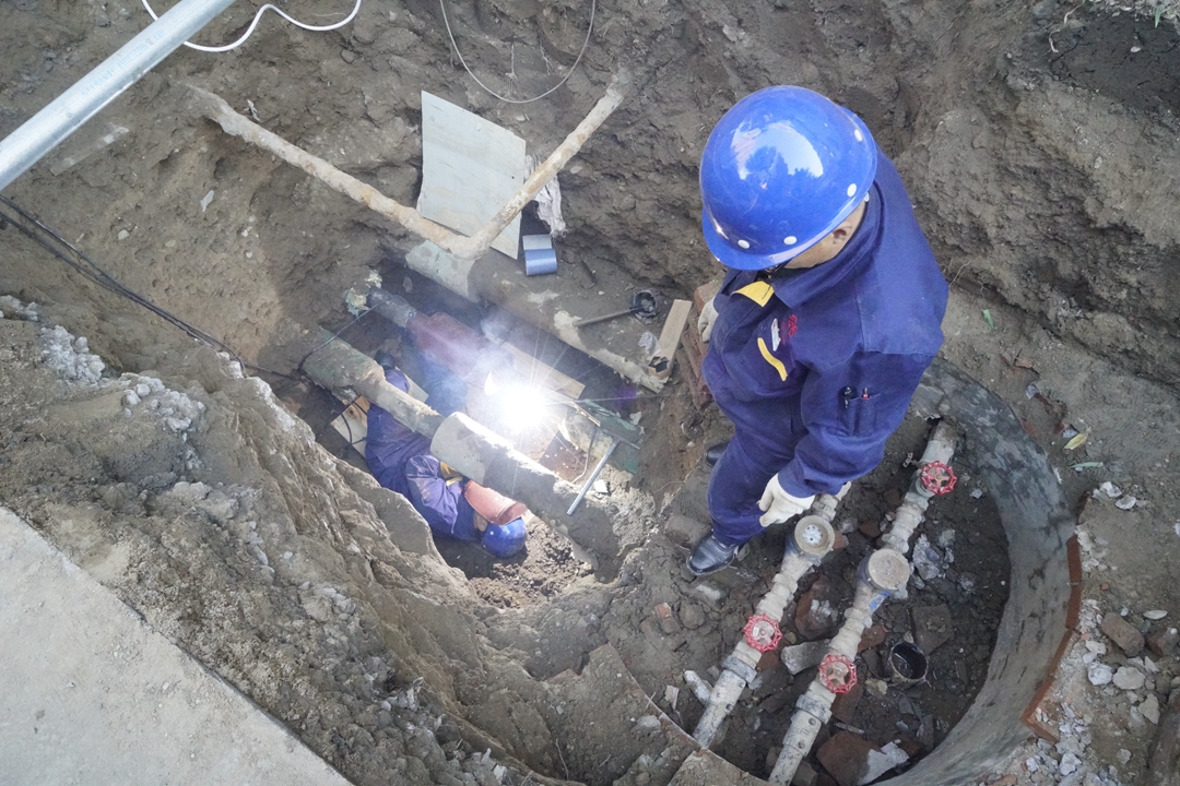 10月28日上午9時(shí)切割地面開始挖土。多名員工輪流上陣連續(xù)作業(yè),挖坑長5米多,寬2米,深3米土坑,挖土近30立方米。在29日下午15時(shí)左右找到漏水點(diǎn)準(zhǔn)備焊接工作。電焊工薛江、呂家斌在狹小的空間內(nèi)開始焊接,連續(xù)四個(gè)小時(shí)的細(xì)致焊接,兩人克服種種困難完成任務(wù)。之后開啟供暖補(bǔ)水泵補(bǔ)水,確認(rèn)焊接口不漏水。