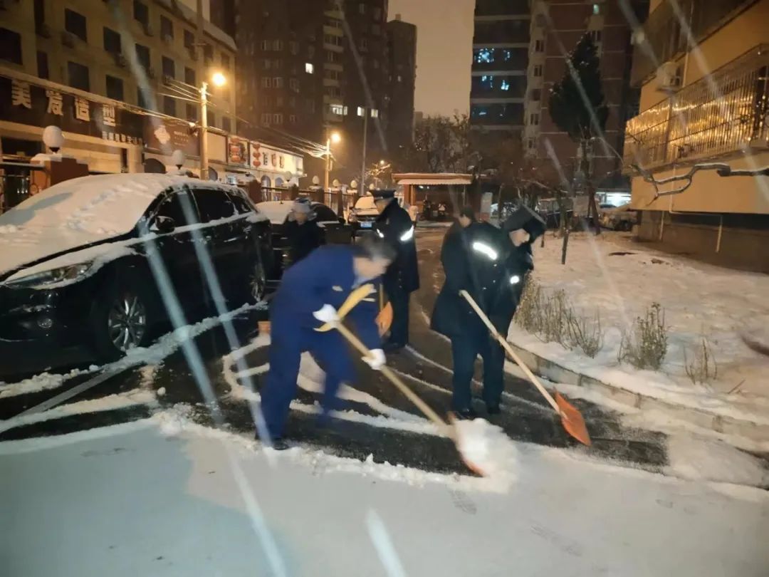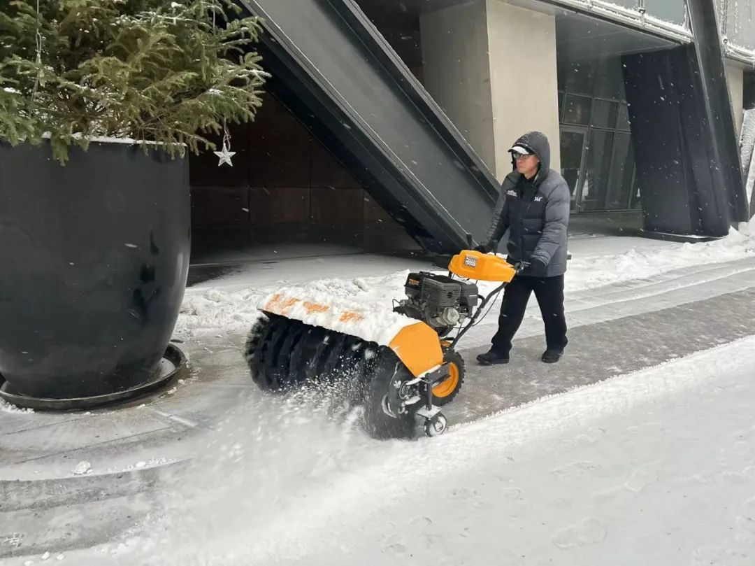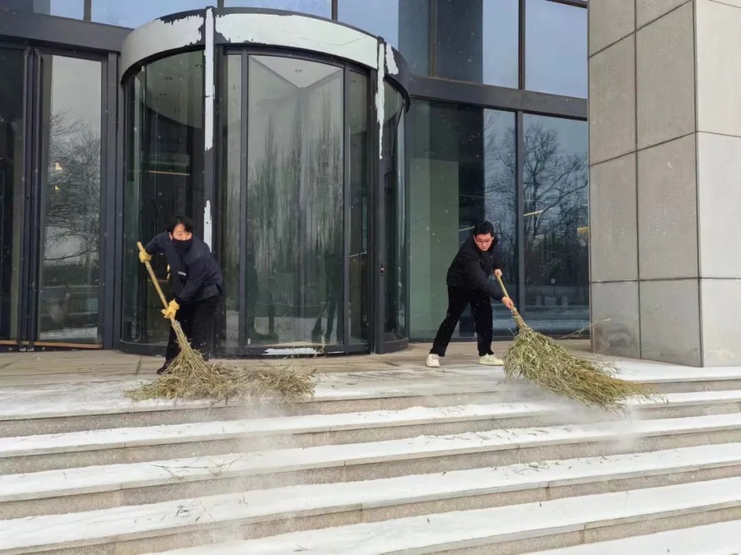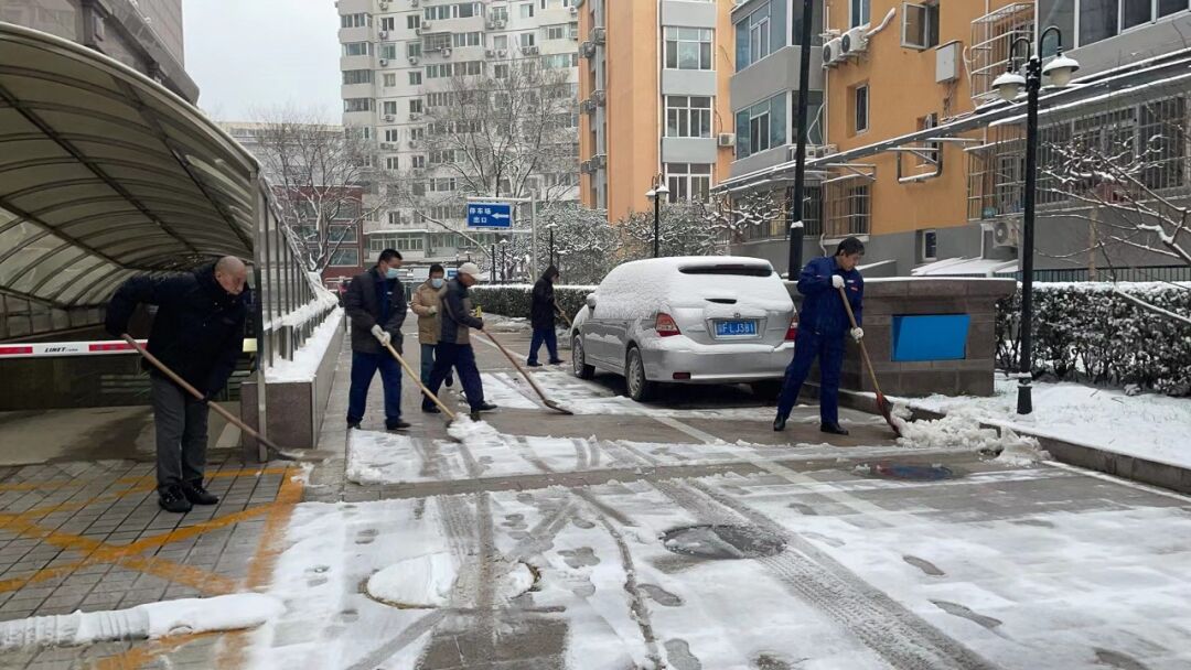 由于兩次降雪天氣間隔時間短、持續(xù)時間長,疊加效應(yīng)明顯。為最大限度地減少降雪天氣對業(yè)主出行造成的影響,公司各項(xiàng)目利用兩次降雪間歇期,合理調(diào)配人員,清點(diǎn)物資儲備,加強(qiáng)室外設(shè)施設(shè)備和室內(nèi)供暖系統(tǒng)巡視并做好防凍措施,對掃雪設(shè)備進(jìn)行維護(hù),全面做好掃雪鏟冰、供熱保障等應(yīng)對工作。降雪如期而至,迎著不斷飄落的雪花,中廣人在刺骨寒風(fēng)中揮帚清掃積雪,在冰天雪地里敲鏟清理結(jié)冰的身影遍布于轄區(qū)每一個角落,各項(xiàng)目按照“隨下隨清”的原則,采取先主后次,分段劃片等方式,確保轄區(qū)出入口、主干道無積雪、不結(jié)冰,保障業(yè)主出行安全。