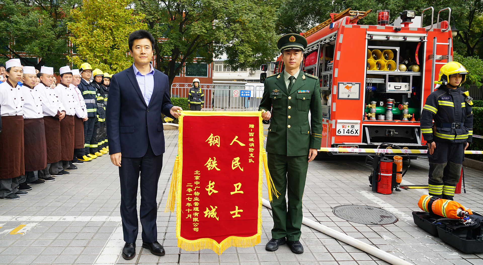 2017年10月25日上午九點三十分,由中廣物業(yè)管理有限公司音像資料館項目部與西城消防支隊 “十九大”駐勤官兵聯(lián)合舉行消防安全知識培訓,首先公司總經(jīng)理安委會主任崔立新代表公司向西城消防支隊贈送“人民衛(wèi)士,鋼鐵長城”錦旗表示感謝,感謝西城消防支隊一直以來對公司消防安全工作的支持與幫助。西城消防支隊劉永強警官表示:十九大勝利閉幕,住地周邊沒有發(fā)生起火冒煙情況,離不開各單位的共同努力,特別是中國廣播電視音像資料館大廈,地理位置特別重要,臨近代表住地,消防安全意識強、工作到位,感謝中廣物業(yè)給予消防工作的支持。隨后消防支隊駐勤消防員進行消防培訓,培訓內(nèi)容理論與實際相結(jié)合,消防支隊駐勤消防員詳細講解了消防車配置設(shè)施及使用、“119”消防報警流程及注意事項,講解并實際操作了消防空氣呼吸器的佩戴及使用和室外消火栓的使用。參加培訓的有公司機關(guān)部室全體員工、公司各部門的消防骨干、駐大廈各單位員工及餐廳工作人員總計100余人參加了培訓,通過消防安全知識的培訓,提升了大家的消防安全責任意識及應對初期火災的處置能力。