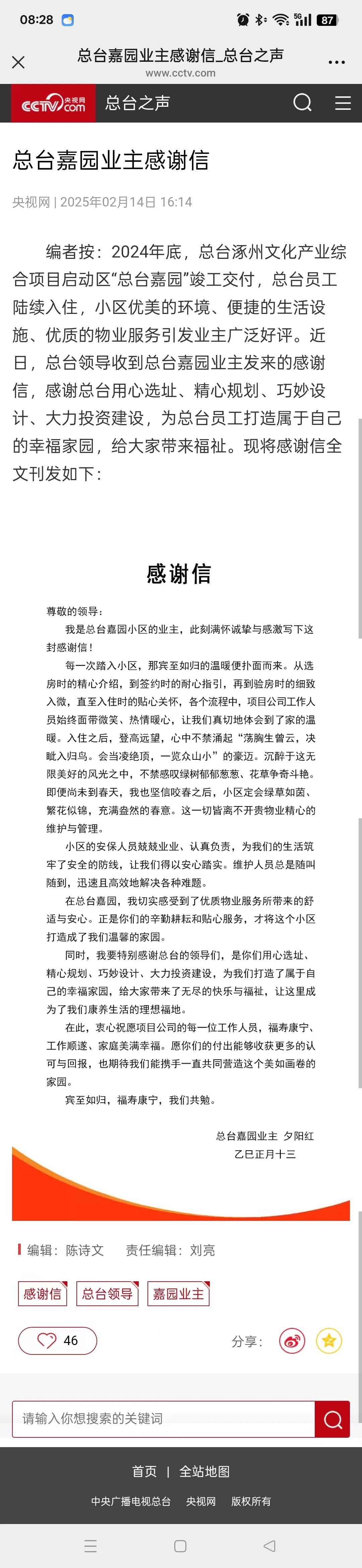 據(jù)央視網(wǎng)總臺之聲報道,近日,總臺領導收到總臺嘉園業(yè)主“夕陽紅”發(fā)來的感謝信,信中感謝總臺用心選址、精心規(guī)劃、巧妙設計、大力投資建設,還對中廣物業(yè)公司優(yōu)質服務給予表揚。
