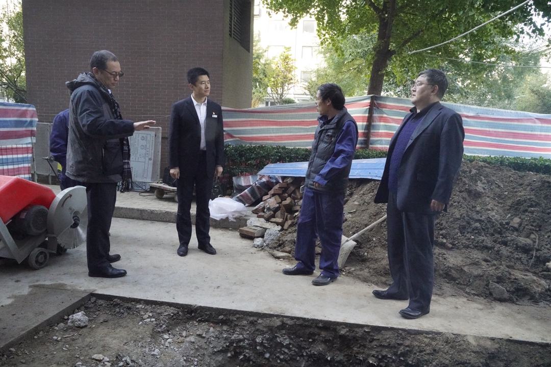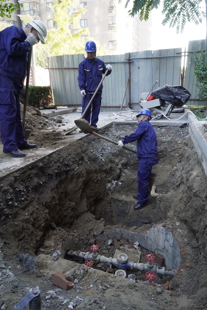 根據(jù)項(xiàng)目部制定的維修方案,項(xiàng)目部主管楊雙玉、真武家園項(xiàng)目主管劉忠進(jìn)及時(shí)組織搶修隊(duì)伍、準(zhǔn)備地面切割工具,挖土的工具鐵鍬、鎬等,組織協(xié)調(diào)人員參加搶修工作。在施工過程中項(xiàng)目部始終把安全工作放在第一位,設(shè)立圍擋,張貼安全提示,搶修人員都戴上安全帽,確保安全。