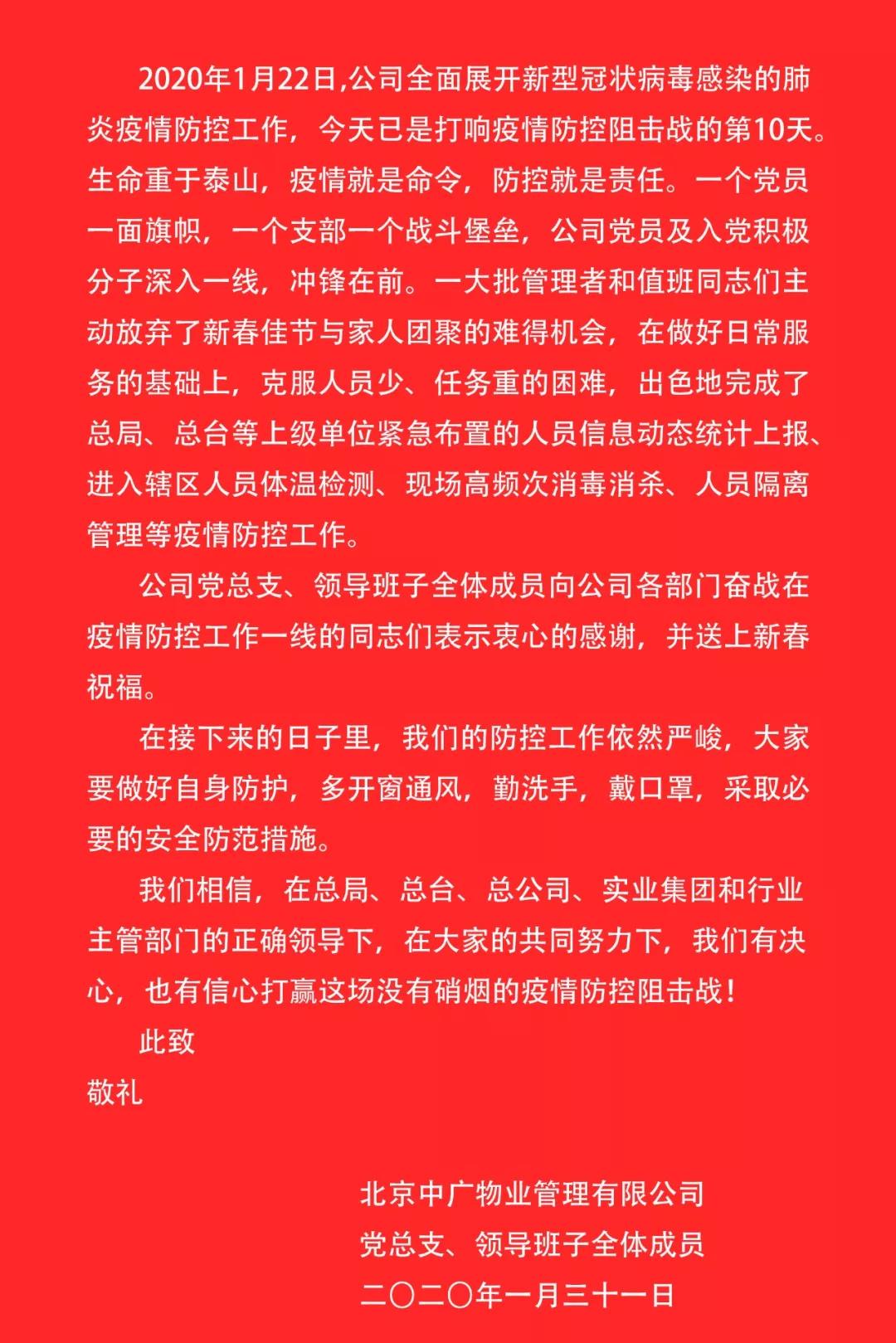 我們相信,在總局、總臺(tái)、總公司、實(shí)業(yè)集團(tuán)和行業(yè)主管部門(mén)的正確領(lǐng)導(dǎo)下,在大家的共同努力下,我們有決心,也有信心打贏這場(chǎng)沒(méi)有硝煙的疫情防控阻擊戰(zhàn)!
