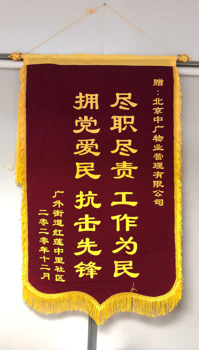 近日,中廣物業(yè)公司央視住宅項(xiàng)目部廣外紅蓮項(xiàng)目榮獲屬地廣外街道紅蓮中里社區(qū)“盡職盡責(zé)、工作為民、擁黨愛民、抗擊先鋒”錦旗,感謝中廣物業(yè)公司在抗疫一線和垃圾分類工作中作出的重要貢獻(xiàn)。