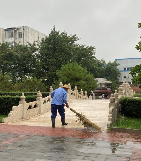 7月18日上午,疾風(fēng)驟雨中,中廣人無畏無懼,不顧淋濕的衣衫,清掏淤泥落葉、沙袋抵御積水,在京各項目利用公司提前購置18臺排水泵等防汛物資,持續(xù)清潔積水路面,保證業(yè)主出行安全。