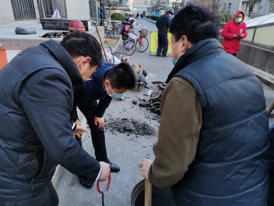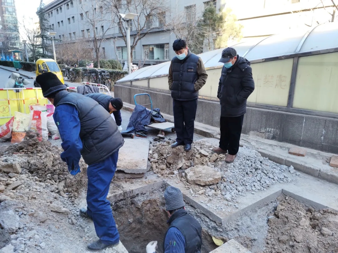 次日早8:00,項(xiàng)目部組織維修人員按照預(yù)定方案,布置好安全防護(hù)、警戒等措施后開始作業(yè),大家頂著凜冽的寒風(fēng)輪番開鑿地面、挖土方,于下午16:30找到了漏水點(diǎn)。但由于漏水點(diǎn)在暖氣管井底混凝土下,給搶修工作增添了難度,為了不破壞暖氣管井,減少停暖對住戶的影響,項(xiàng)目部及時(shí)調(diào)整搶修方案,決定采取管井外斷管,再敷設(shè)新管鑿?fù)ň谂c井內(nèi)管道連接的方案,并決定第三天再予以搶修。