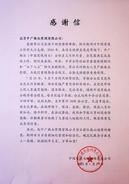 來信表示,中廣物業(yè)公司在國(guó)家廣電光纜干線網(wǎng)重要保障期,特別是春晚、兩會(huì)、中非合作論壇等重要保障期間和“七下八上”防汛關(guān)鍵期內(nèi),對(duì)物業(yè)人員嚴(yán)格要求管理,公司團(tuán)隊(duì)加班加點(diǎn)、恪盡職守,在會(huì)議、夜間和節(jié)假日等時(shí)段安保值勤、后勤服務(wù)方面做了大量深入細(xì)致的工作,保質(zhì)保量完成各項(xiàng)任務(wù),為中國(guó)有線重保期安全保衛(wèi)、后勤支持提供重要保障。同時(shí),公司保障團(tuán)隊(duì)每日往返于翠微、公主墳兩個(gè)辦公區(qū),不辭辛苦、風(fēng)雨無阻,全年累計(jì) 3600 余公里,無違章違法,安全無事故。在此,向中廣物業(yè)公司致以誠(chéng)摯的謝意。